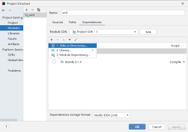 3. 进行导入设置:同样进入“project structure”,选择“modules”,点击“dependencies”标签页,点击“+”按钮,选择“jars or directories”。