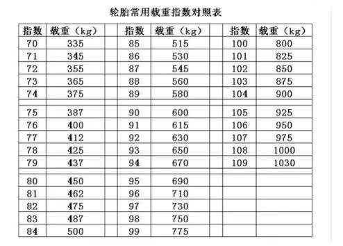 载重指数是一个对应于最大载重量的数字(单位:公斤),表明了轮胎在正常充气情况下能够承受的最大重量。您还可以在胎侧的其他地方找到模制的、以磅或以千克为单位的最大载重量数字。当然,如果汽车的负重长时间超过这个范围,那么轮胎的磨损也会加剧,影响它的使用寿命,甚至有爆胎风险。