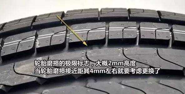 轮胎上有一侧用磨损极限标志表示该轮胎的磨损极限,一般为2mm。当该轮胎的磨损接近4mm时,车主就要考虑更换轮胎了。