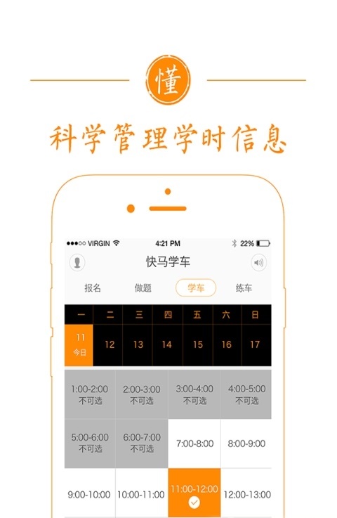 3、计时练车:自由选择自己的空余时间,约一个教练,按时收费,自由填写练习内容,告别“小菜”。