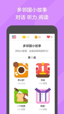 一边掌握新单词、短语和语法,一边赚取虚拟货币、解锁冲关还有提升语言熟练度!