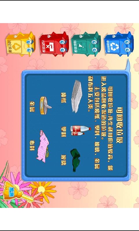 1. 根据屏幕上出现的垃圾种类,准确拖动到对应的垃圾桶。